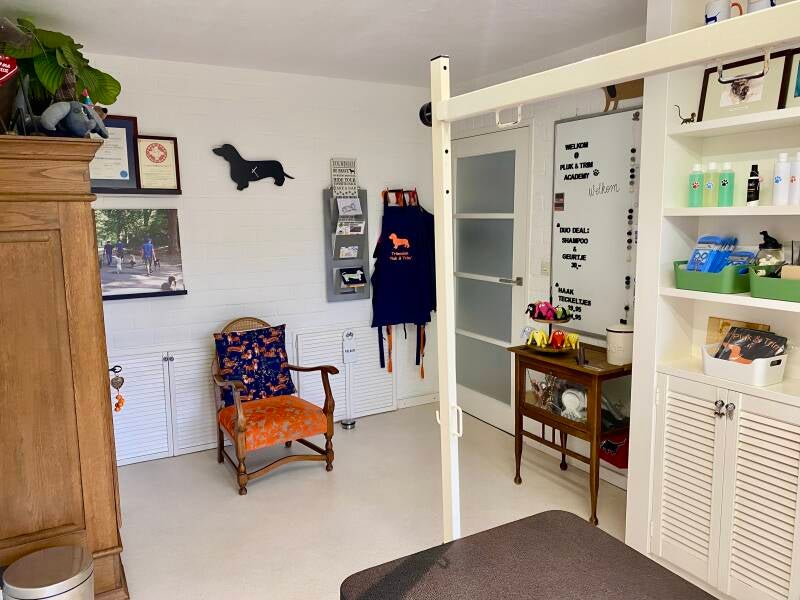 De trimsalon is voorzien van een in hoogte verstelbare trimtafel en bad. Dat is fijn voor je teckel en geeft mij veel werkplezier. Voor het drogen van je teckeltje gebruik ik een grote handdoek en föhn.